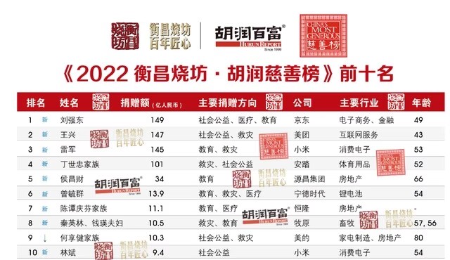 2022胡润慈善榜榜单统计2021年4月1日至2022年8月31日期间的现金和股权捐赠,以及有法律效力的承诺捐赠。