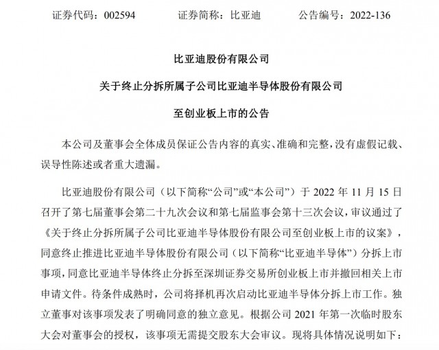 11月16日消息,比亚迪发布公告称,11月15日,董事会审议通过了《关于终止分拆所属子公司比亚迪半导体股份有限公司至创业板上市的议案》,同意终止推进比亚迪半导体分拆上市事项,同意比亚迪半导体终止分拆至深圳证券交易所创业板上市并撤回相关上市申请文件。待条件成熟时,公司将择机再次启动比亚迪半导体分拆上市工作。