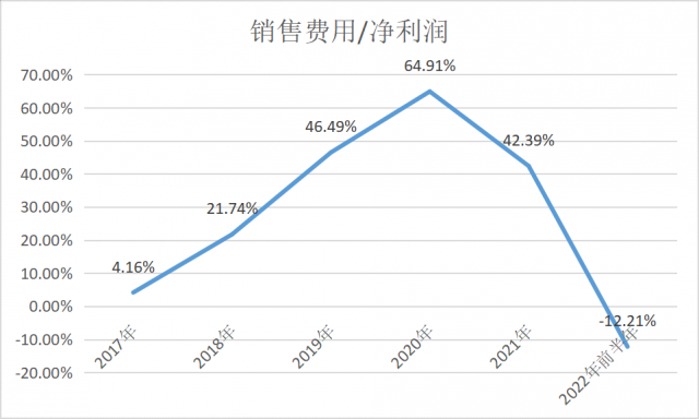 陆玖商业评论通过数据得知,2017年到2022年前半年,蓝月亮通过营销费用换来净利润的转化率先实现了快速增长,而在2020年达到顶峰后出现断崖式下降,数据已经完全说明,烧钱式营销已不能够为蓝月亮带来大幅增长。