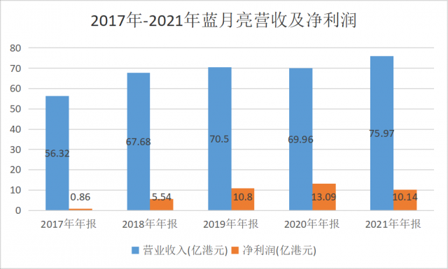 从2017年到2021年5年间,蓝月亮营业收入从56。32亿港元增长到75。97亿港元。净利润也从最初的0。86亿港元,增长到了2021年的10。14亿港元,但是要注意2020年,蓝月亮的营收比2021年要低,但是净利润却下滑了22。5%。