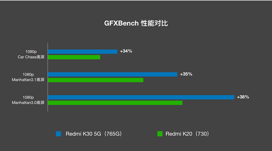 实测可见,在曼哈顿3。0离屏测试中,骁龙765G比骁龙730提升38%。在曼哈顿3。1离屏测试中,提升35%。而负载更大的Car Chase离屏测试中,骁龙765G提升34%。